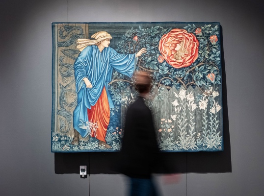 Bild links: Sir Edward Burne-Jones und William Morris: Wirkteppich „Der Pilger im Garten oder das Herz der Rose“