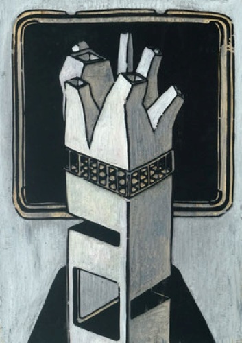 Immer wieder schreibe ich hier über die Bildwelt zwischen Gegenständlichkeit und Abstraktion und Sergei Mosers Arbeiten berühren mich an einem weiteren Schwerpunkt meines eigenen Zugangs zur Kunst: während der Künstler ganz frei, virtuos und ohne selbstverständlich gegenständliche Elemente (menschliche Figuren, Gesichter) überall einsetzt, wo es ihm passt, verblüffen immer wieder eher fremde, technoide, vielleicht halborganische Wesen oder Elemente, die mich erinnern an Bilder (Bilder, die ich gesehen habe oder die ich mir beim Lesen vorgestellt habe; genau unterscheiden können wir das ja rückblickend oft gar nicht ) aus der Welt der Science-Fiction: ganz konkret sind es Assoziationen zu Orwells 1984, Assoziationen zu totalitären Systemen, alle eher bedrohlich als angenehm oder vertrauenerweckend.