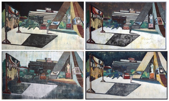 (Unendlich?) viele Möglichkeiten? Natürlich sind die besonderen Möglichkeiten des ja sehr aufwändigen Linoldruckverfahrens auch Thema beim Gespräch mit Sergei Moser. Der Künstler, der gerade bei seinen großen Arbeiten oft Wert legt auf eine malerische Wirkung, erklärt mir die kreativen Möglichkeiten, die ihm nur der Linoldruck bietet: Ist die Form erst mal fertig, kann er beim Drucken dann vielerlei Varianten gestalten; Feinheiten, die Oberflächenstruktur betrefend oder auch einfach ganz verschiedene Farbkombinationen. So finden wir auf der Website des Künstlers das Preisträger-Bild in gleich 4 Varianten: