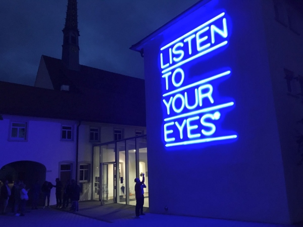 Sehr gut passt auch dazu der Slogan, den Sie am Eingang zur Galerie in Form eines Werkes der Lichtkunst sehen: Listen to your Eyes