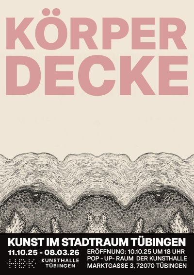 Unter dem Motto Körperdecke werden in der neuen Spielstätte der Kunsthalle, in der Marktgasse 3, sowie an weiteren ausgewählten Orten im Stadtraum von Tübingen ab dem 11. Oktober 2025 Arbeiten und künstlerische Interventionen von Studierenden der HBKsaar, Saarbrücken, der Öffentlichkeit präsentiert.