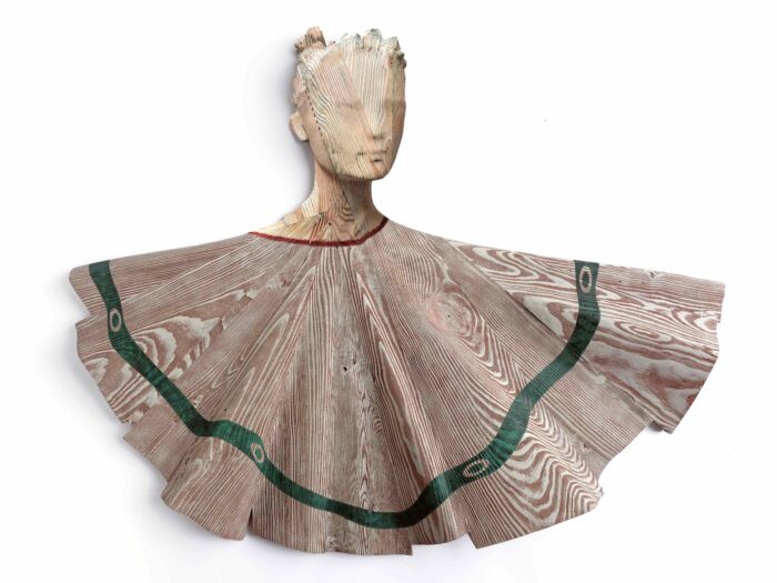 In diesen Büsten der Anonymität, diesen merkmalslosen Identitäten, navigiert eine menschliche Vorstellung. Der Geist ist ein treibendes Territorium, ein Ort der Perkussion und des Aufbruchs. In den Skulpturen von Reinhard Voss erblüht der Gedanke zu farbigen Flächen mit ausweichenden Linien. Die Holzfaser ist der Knackpunkt der Widersprüche und Paradoxien des Seins. Fragmentierte, zusammengesetzte Persönlichkeiten, aber vereint durch die Spannung der Seele, sind diese komplexen Formen durch Tinte gekennzeichnet, wie die Erfahrung den Blick färbt.