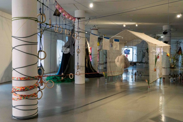 Ausstellungsansichten – im Zentrum offenbar eine Rauminstallation mit vielen Seilen; in der Mitte ein Lagerfeuer? Bilder sehr eigener Art, die mich auf Anhieb begeisterten. Eine spannend erscheinende und besondere Atmosphäre, eine eigene, mit vielen Seilen und Schnüren auch märchenhafte und (modern, aber oft treffend:) immersive Welt.