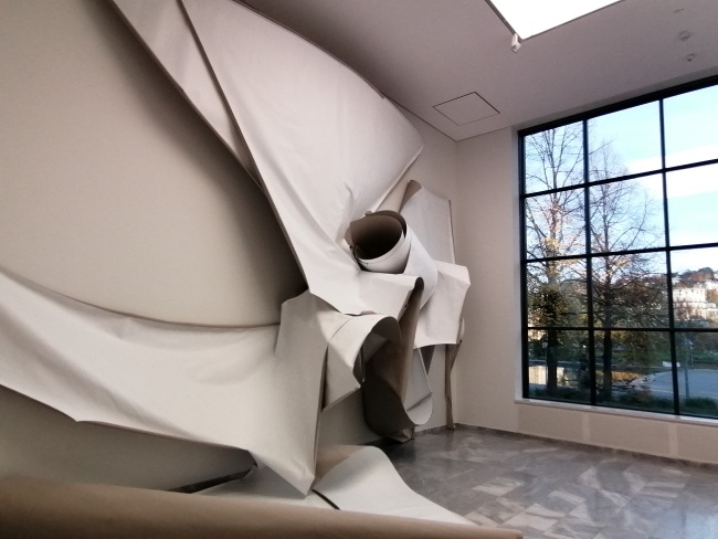 Grosses Werke sind die großartige Einladung Grenzen zu überschreiten, Sehen neu zu erleben, Sichtweisen zu verändern. Katharina Grosse, bekannt für ihre temporären Farb-Raum-Wunder, überrascht bei dieser Ausstellung auch mit skulpturaler Malerei ohne Farben „Untitled“– eine weiße Leinwand die sich in amorphe Formen auflöst und durch den Blick nach draußen die Wahrnehmung der realen Welt verändert. Auch „The Ghost“ – eine Plastik ganz aus weißem Styropor, überwältigend in ihrer auf Formen reduzierten raumfüllenden Präsenz, ihrem Zusammenspiel von Form und Fläche und der Abwesenheit von Farbe. Einfach Gross(e)artig.