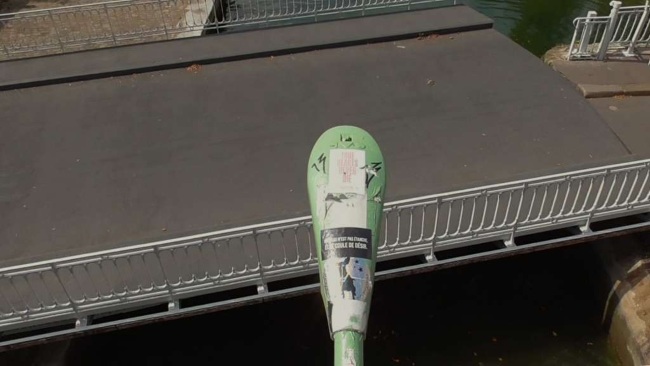 Kuppels neuester Film »SCHNITT/STELLEN« wurde am Canal Saint-Martin in Paris gedreht. Zwei mobile Brücken über den Kanal werden in Aufsicht zu Film-Schnittstellen. Das Öffnen und Schließen einer Drehbrücke dient Kuppel als Montagetechnik, als eine in Zeitlupe gefilmte Wischblende, bei der ein Bild von einem anderen überlagert wird. In geschlossenem Zustand wird die Brücke so zu einem Schauplatz einer Szene, in der Passant:innen in beide Richtungen zum gegenüberliegenden Ufer strömen. Kanalaufwärts hebt und senkt sich eine Hebebrücke wie ein Vorhang, der im geschlossenen Zustand zur Bühne wird, über den sich der Verkehr drängt. Hebt sich die Brücke, gibt sie den Blick auf den Kanal mit seinen vorüberziehenden Booten frei. In die Sequenzen der Brückenmanöver sind verschiedenste Definitionen des heute inflationär verwendeten Begriffes „Schnittstelle“ wie im Stummfilm durch harte Filmschnitte montiert. »SCHNITT/STELLEN« ist somit ein Film über Bilder und Begriffe und deren unterschiedlichsten gegenseitigen Zuordnungen.