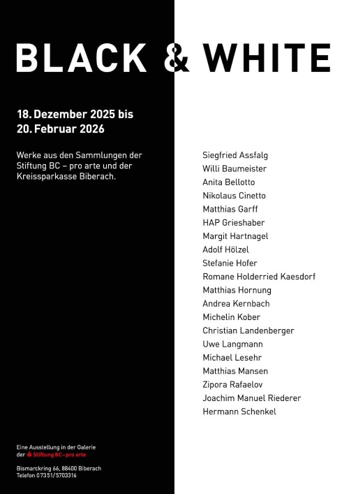 Wie groß das Spektrum an Ausdrucksmöglichkeiten in Schwarz-Weiß im Spannungsfeld von Abstraktion und Figuration sein kann, zeigt die Ausstellung „Black & White“ aus den Beständen der Stiftung BC – pro arte und der Kreissparkasse Biberach in Fotografien, Druckgrafiken, Zeichnungen, Malerei und Skulptur. Mit Werken von Siegfried Assfalg, Willi Baumeister, Anita Bellotto, Nikolaus Cinetto, Matthias Garff, HAP Grieshaber, Margit Hartnagel, Adolf Hölzel, Stefanie Hofer, Romane Holderried Kaesdorf, Matthias Hornung, Andrea Kernbach, Michelin Kober, Christian Landenberger, Uwe Langmann, Michael Lesehr, Matthias Mansen, Zipora Rafaelov, Joachim Manuel Riederer und Hermann Schenkel.