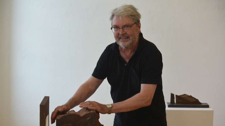 Bild oben: Der Bildhauer Rudolf Kurz mit einer Skulptur aus der „Tigerauge“-Serie: