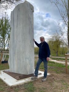 Bild links:Rudolf Kurz: Skulptur, 1998; Stadtwerke Aalen; Marmor, Edelstahl; Höhe 340 cm