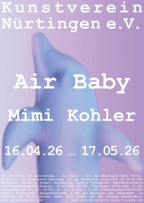 Ein Roadtrip zum Meer; die Reise in eine unbestimmtere Zukunft führt Mimi Kohler (*1995) unvermittelt zu einer Reise in die eigene Vergangenheit und dem Kindheitstraum schlechthin eines jeden 90ies-Strandurlaubs: dem hellgrauen, aufblasbaren PVC-Delfin mit benommenem Lächeln. Überragte das 1,60 Meter lange Wasserspielzeug die Künstlerin früher sind die beiden nun auf dieselbe Größe angewachsen; der ehemalige Riese persönlicher Erinnerungsträger und Relikt; gleichermaßen Dreh- und Angelpunkt von Kohlers Einzelausstellung – Air Baby – im Kunstverein Nürtingen geworden.