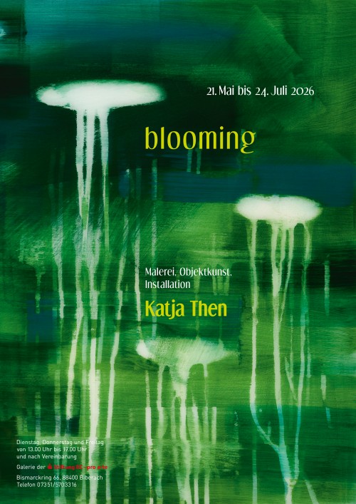 Abstrahierte Naturmotive spielen auch in Thens Malerei in Acryl eine zentrale Rolle. Schichten aus Mustern und Ornamenten, die mit Schablonen oder Walzen aufgetragen werden und an alte Tapeten oder Stoffe erinnern, werden von malerisch-diffusen Passagen wie aufreißende Wolken überlagert. Ovale Blütenschemen auf feingliedrig herabfließenden Stielen schweben tänzerisch durch abstrakte Bildräume in magisch leuchtender Farbigkeit. Ihre Luftschlösser baut die Künstlerin aus transparentem Architektenentwurfspapier: Ob Malerei oder Objektkunst – das Alltägliche verwandelt sich bei Katja Then zu Manifestationen einer nostalgischen Traumwelt.