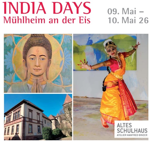 Klassischer Tempeltanz, zeitgenössische Kunst und indische Küche: Am 9. und 10. Mai verwandelt sich das Alte Schulhaus in Mühlheim an der Eis in einen Begegnungsort zwischen zwei Kulturen. Das Atelier Manfred Binzer im pfälzischen Mühlheim an der Eis lädt zu den ersten India Days ein – ein zweitägiges Kulturprogramm, das Bildende Kunst, klassischen indischen Tanz und kulinarische Genüsse vereint.