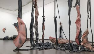 Tatsächlich hat die Künstlerin zu „kontaktarm“ einen Videofilm produziert. Dieser war dann bis Mai 2021 noch zu erleben im Rahmen der Ausstellung Deltabeben in der Kunsthalle Mannheim. Der zweite Teil der Präsentation von Fritzi Haußmann in dieser Schau war eine raumgreifende, große Skulptur, die erneut auf Fahrradschläuchen basiert und mit der sie auf ihren Ausstellungs-Raum in der Kunsthalle Bezug nimmt: