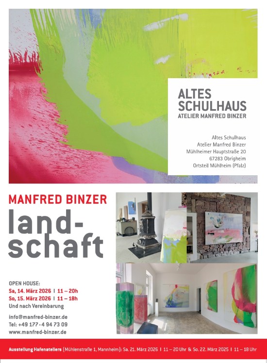 Neu am 22. Februar 2026: | Manfred Binzer: 14. und 15.03.2026 | Atelier Altes Schulhaus Obrigheim: | Offenes Atelier Manfred Binzer