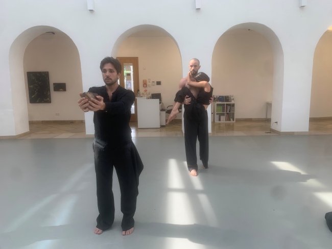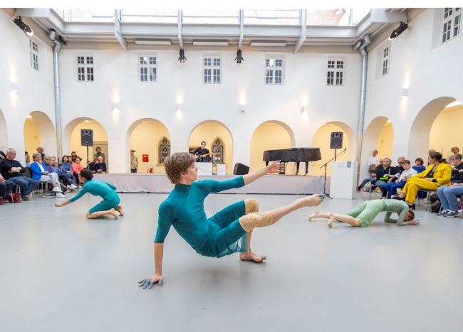 Diese Liste hier ließe sich noch verlängern, weil der Galerieleiterin zu jeder neuen Ausstellung auch passende Formate (literarische oder auch mal szenische Lesungen) einfallen. Vor allem Tanz – Workshops und – Performances haben in die „Fähre“ Einzug gehalten. Aufgrund ihrer beruflichen Vorerfahrungen verfügt Alexandra Karabelas hier über ein umfassendes Netzwerk, so dass ihr für jede neue Idee schnell die richtigen Kooperationspartner einfallen. Immer wieder sind demzufolge Live Acts, Performances und Mini-Aufführungen hervorragender Tänzerinnen und Tänzer in den Ausstellungen aufgetaucht. Erst am Sonntag erlebte eine große Runde an Interessierten das öffentliche Training des hochkarätigen Ensembles TANZ HARZ im Lichthof des Alten Klosters mit. Immer spielt der lebendige Körper im Kontext der jeweiligen Ausstellungen und des Raumes eine große Rolle, um, wie sie sagt“, die Besuchererfahrung auf eine besondere, sinnliche Weise im Blick zu haben. Das Thema insgesamt beschäftigte sie auch in ihrer Zeit an der Staatsgalerie, wo sie im Jahresheft „Stirling“ dazu einen Beitrag verfasst hatte. Wer das besondere Engagement und die eigene künstlerische Arbeit der Bad Saulgauer Kulturchefin speziell für das Ballett und den zeitgenössischen Tanz genauer kennen lernen möchte, sollte sich auf der Webpage www.tanznetz.de umschauen oder stöbert ihre alte ihre Website tanz-denken.de (http://www.tanz-denken.de) auf.