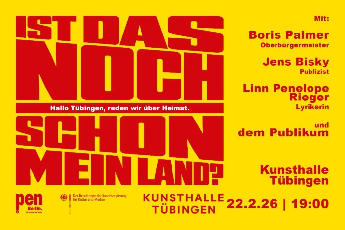 Neu am 08. Februar 2026: | 22.02.2026; 19 Uhr | KunsthalleTübingen | Diskussion in der Kunsthalle Tübingen: | »Ist das noch/schon mein Land?« | PEN zu Gast in der Kunsthalle Tübingen