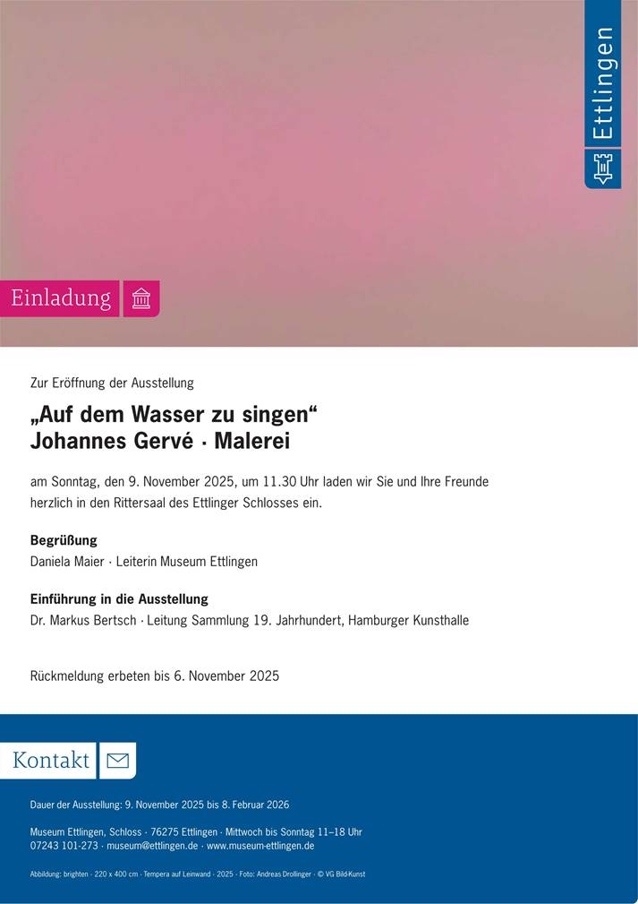 09.11.2025 – 08.02.2026 | Johannes Gervé | Museum Ettlingen | Eröffnung am So, 09.11.2025 um 11:30 Uhr | Auf dem Wasser zu singen – Malerei von Johannes Gervé
