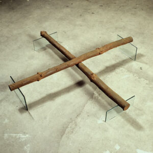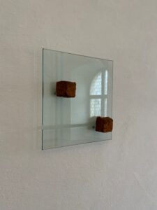 Idealtypisch erscheint mir dazu seine Werkgruppe „Am Ende der Erinnerung“: 7 Arbeiten aus Glas und Gusseisen, die mir der Künstler während unseres Gesprächs an den Wänden seiner Wohnräume zeigt. Hier kombiniert er Glas, Eisen und gewichtiges Gedankengut: als Titel verwendet er Ausschnitte aus 7 Werken der Weltliteratur (von Homers Ilias bis zu Goethes Faust), die auch jeweils einen hohen philosophischen Rang haben. Diese Texte platziert er explizit als Teil der Kunstwerke – als Texte auf den Glaselementen, die somit auch die Funktion übernehmen, wie wir sie sonst von Texttafeln an den Wänden von Museen kennen – neben oder hinter den eigentlichen Kunstwerken. Scheinbar mühelos verbindet der Künstler Elemente der Natur und der Welt des Geistes.
